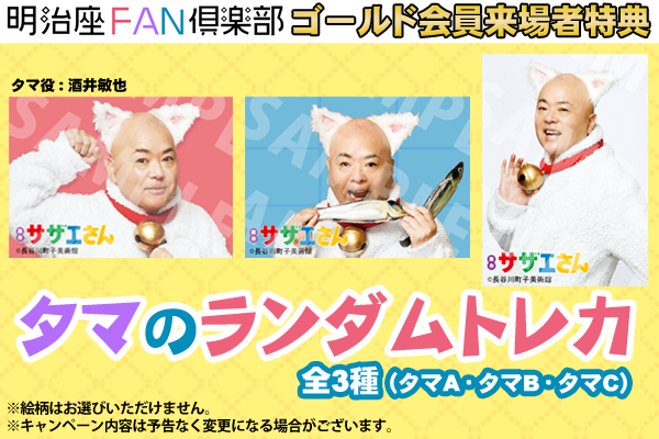 明治座FAN倶楽部では、公演にお越しいただいたゴールド会員様への来場者特典として「タマのランダムトレカ」をプレゼント!