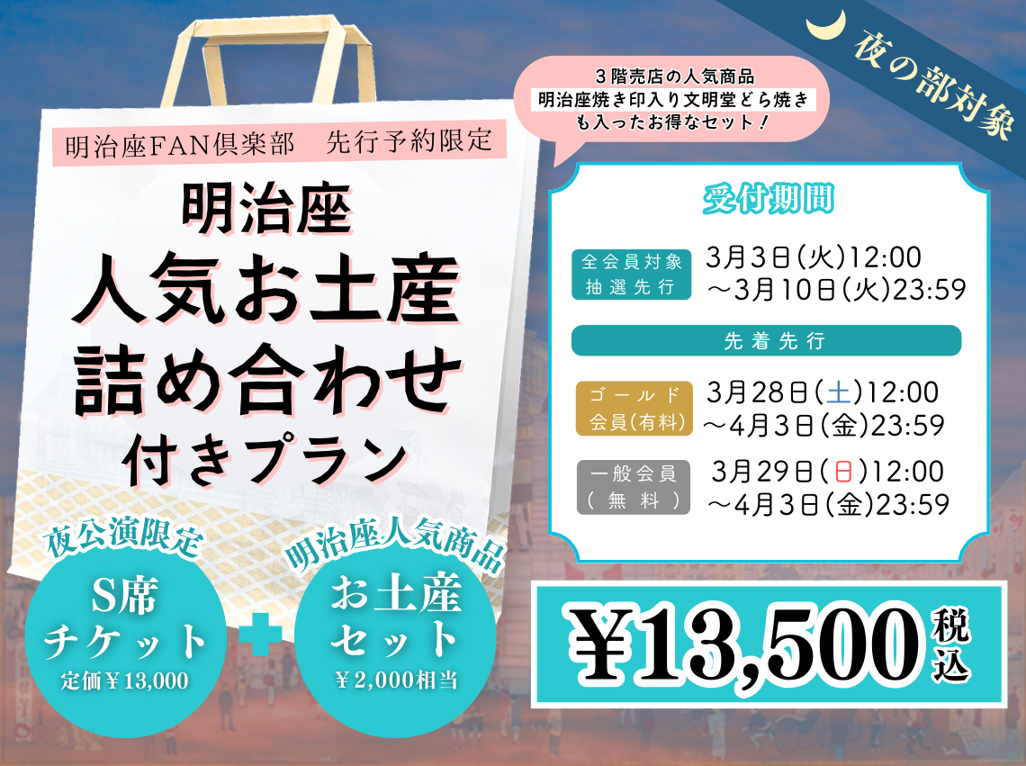 17:00開演の部限定で、S席チケットと明治座売店で人気のお土産詰め合わせがセットになったお得なプランが登場!
