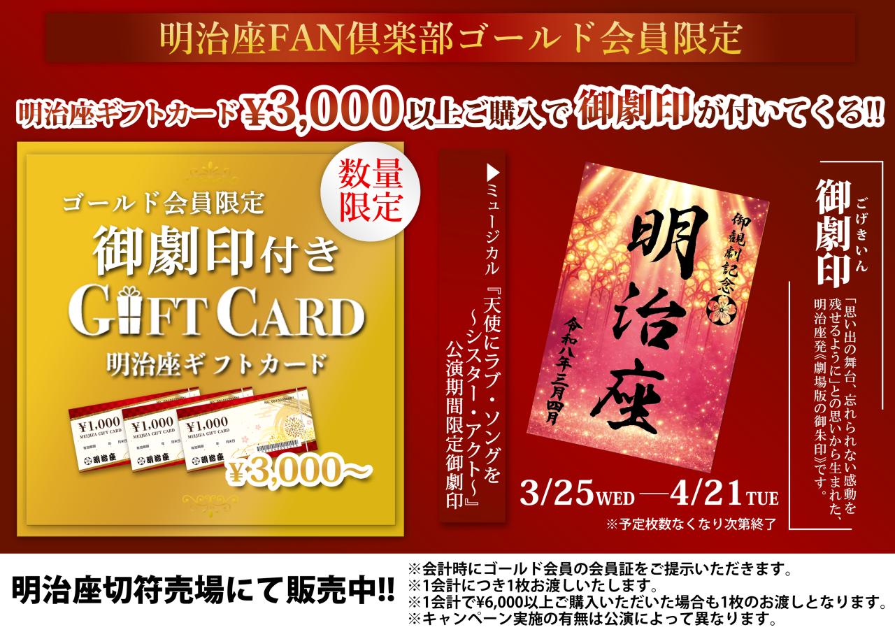 明治座ギフトカードを3,000円以上お買い求めいただいたゴールド会員(有料)限定で、ミュージカル『天使にラブ・ソングを~シスター・アクト~』御劇印をプレゼントいたします!