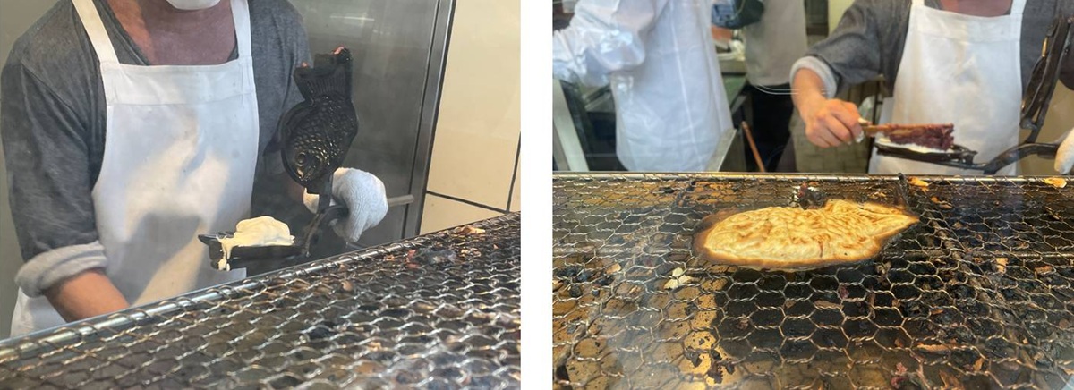 型に生地とたっぷりのあんこが乗せられ、職人さんの手によって止まることなく次々とたい焼きが焼き上げられていきます。