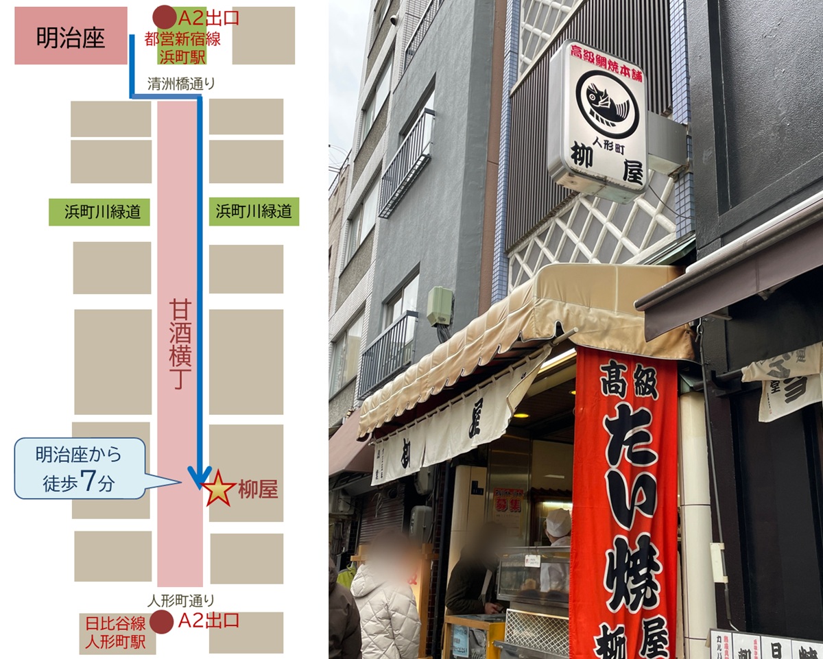 明治座を出て、目の前の大通り(清洲橋通り)を渡った少し先にあるのが甘酒横丁。この甘酒横丁をまっすぐ人形町駅の方へ進んだところに柳屋がございます。お店に近づくにつれて、たい焼きの香ばしい香りが!