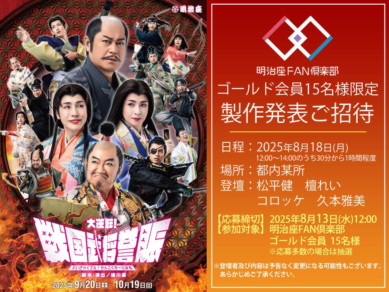 『大逆転!戦国武将誉賑(せんごくかーにばる)』の製作発表に明治座FAN倶楽部 ゴールド会員限定、15名様を抽選でご招待いたします!